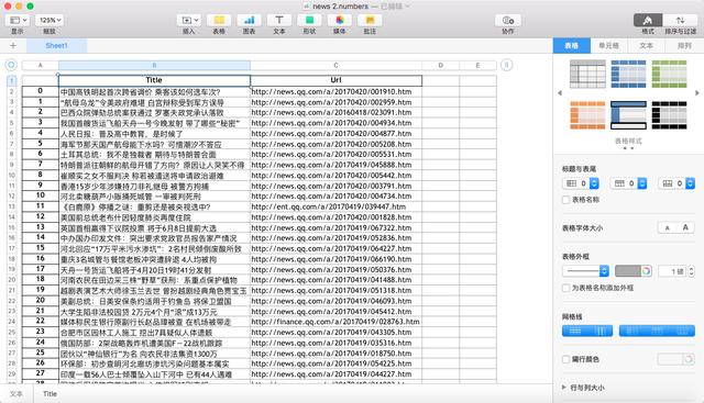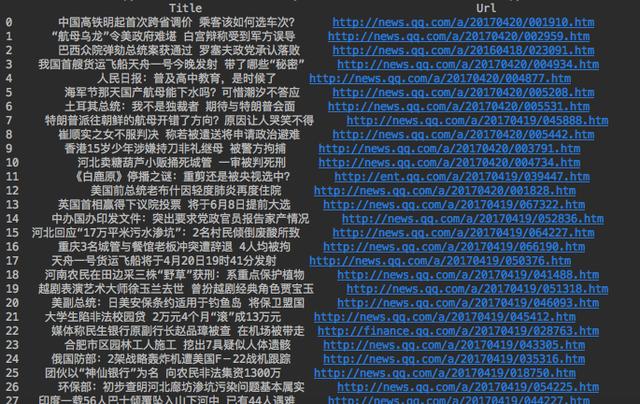 利用Python爬取腾讯新闻首页的标题和链接 Oct 26 2016 环境1、Python3 2、PyCharm 代码123456789import requestsimport pandasfrom bs4 import BeautifulSoupres = requests.get('http://news.qq.com/')soup = BeautifulSoup(res.text,'html.parser')newsary = []for news in soup.select('.Q-tpWrap .text'): newsary.append({'Title':news.select('a')[0].text,'Url':news.select('a')[0]['href']})newsdf = pandas.DataFrame(newsary)print(newsdf) 输出结果 将输出结果保存到本地Excel文件12345678910import requestsimport pandasfrom bs4 import BeautifulSoupres = requests.get('http://news.qq.com/')soup = BeautifulSoup(res.text,'html.parser')newsary = []for news in soup.select('.Q-tpWrap .text'): newsary.append({'Title':news.select('a')[0].text,'Url':news.select('a')[0]['href']})newsdf = pandas.DataFrame(newsary)newsdf.to_excel('news.xlsx') 结果 打开文件