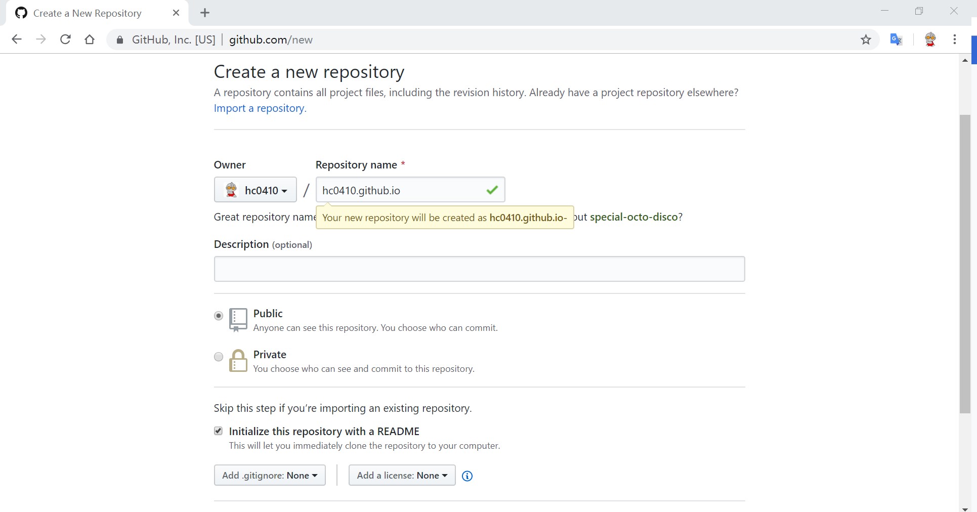 1.Github新建项目,项目名格式:账户名.github.io,并且需要勾选Initialize this repository with a README