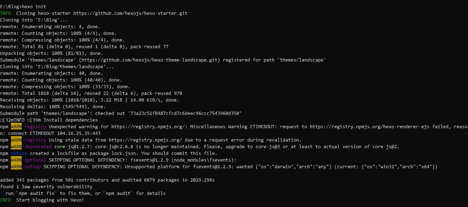 4.输入hexo init,初始化该文件夹(时间有点长!)